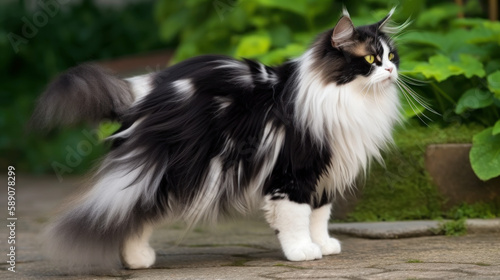 Outdoor picture of long hair black and white cat, fashionable long-hair cat in nature, generative ai
