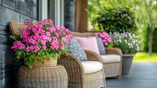 outdoor porch decor, porch adorned with wicker chairs, comfy cushions, and potted flowers, leaving room for text