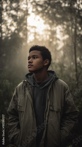 Outdoor portrait of a girl, Indigenous female, teenager at the forest edge in soft dawn light, captured with a calm, grounded expression. Ethnic teenager in forest at evening, trees and plants in back