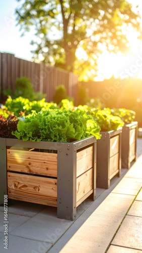 Outdoor Urban Garden Boxes Filled With Leafy Green Vegetables Under Bright Sunlight