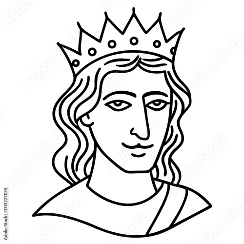 king, crown, outline, drawing, male, monarch, royals, portrait, head shot, character, illustration, artistic, design, hair, face, ruler, symbol, vignetting, graphic, noble, leadership, masculine, heritage, vintage, mediaeval, historical, culture, art, doodle, creativity, simplicity, imagination, royalty, legend, fantasy, creative, facial features, expression, charismatic, timeless, cartoon, linear, minimalistic, black-and-white