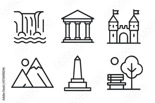 Outline icons of waterfall, temple, castle, mountains, monument, and park scene
