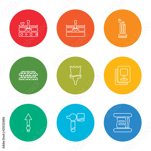 outline stroke paper, hammer, arrow, book, brush, bricks, column, fossil, fossil, vector line icons set on rounded colorful shapes