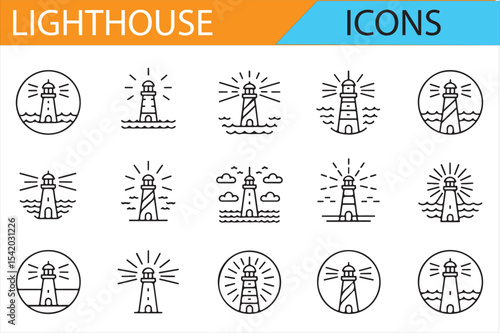 Outline Vector Icons for Maritime and Coastal Designs with Lighthouses and Ships