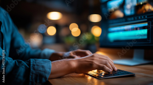 over shoulder of hands dragging a timeline clip in a video editor interface abstracted and brandless studio lamp cones defocused composition with upper margin free