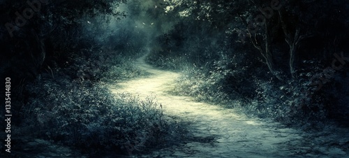 path, overgrown, lost, weed, forgotten, obscured, decayed, confusion, tangled, disorder, ageing, fading, blocked, unclear, contrast, dramatic, lighting, shadow, modelling, chiaroscuro, illustration, panorama, wide, banner, title, landscape, horizontal, hero, background, desktop, wallpaper