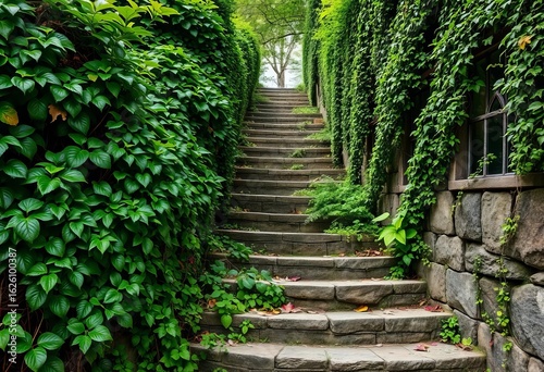 Overgrown stone stairs swallowed by lush, green vines, winding stairs, secret