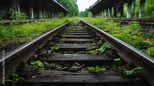 overgrown, train, track, lead, break, station, nature, abandon, reclaim, disuse, overgrowth, foliage, echo, nostalgia, crumble, pathway, history, decay, remnant, texture, tranquil, scenic, transit, journey, forget, travel, derelict, wilderness, adventure