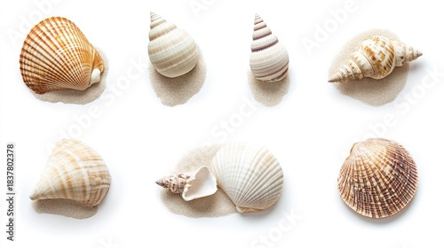 shell, beach, ocean, coast, sand, white, isolated, nature, summer, texture, design, pattern, object, closeup, marin, spiral, swirl, stripes, ridge, line, surface, smooth, brown, beige, tan, gold, ivory, colours, vacation, travel, holiday, tropical, coastal, environment, artwork, concept, natural, element, background, decorative, arrangement, group, different, various, collection, aquatic, beauty, delicate, composition