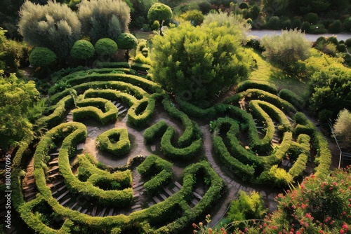 Overhead shot of garden with circular maze, An aerial view of a labyrinth garden, AI generated