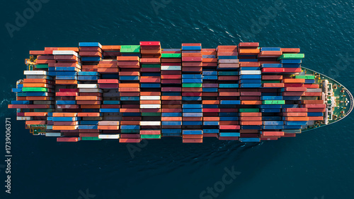 ship, cargo, container, ocean, water, transport, shipping, freight, logistic, supply, trade, commerce, global, delivery, import, export, business, industry, marin, sea, blue, green, red, orange, yellow, brown, purple, stack, stacked, row, pattern, aerial, overhead, perspective, view, top, movement, travel, voyage, navigation, hull, deck, structure, metal, steel, load, capacity, weight, distribution