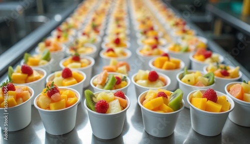 Overhead view of a conveyor belt with rows of yogurt cups topped with vibrant tropical fruit pieces in a clean industrial setting. Ideal for dairy production and food packaging