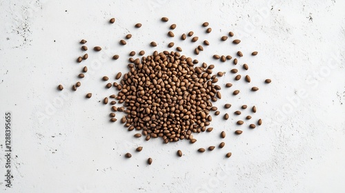 Overhead view of a pile of brown almonds with some almonds scattered on a white textured surface