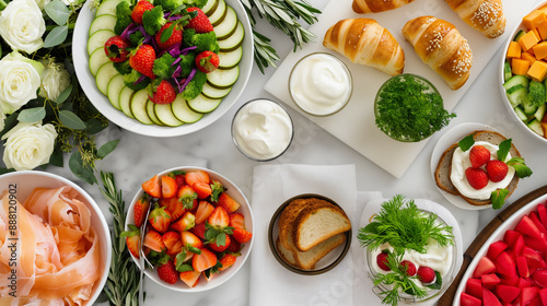 Overhead view of a wedding brunch spread with items like smoked salmon bagels, fruit parfaits, and fresh pastries, beautifully arranged