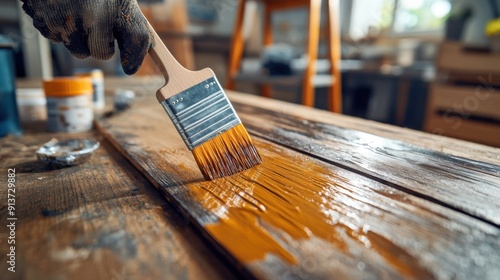 overhead, view, workspace, wooden, board, coated, flaxseed, oil, paintbrush, applying, fresh, layer, polyurethane, difference, texture, finish, 2