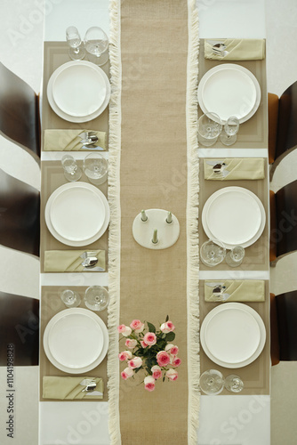 Overhead view of an elegant dining table set for six with white plates and glasses alongside a burlap table runner and fresh pink flowers as centerpiece, creating a serene ambiance