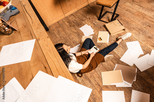 Overhead view of cafe owner with calculator near table, papers, credit card and folders on floor