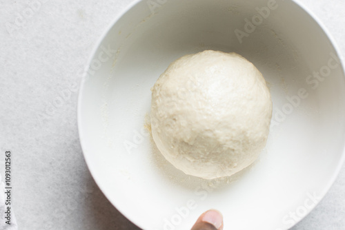 Overhead view of challah dough being shaped in white bowl, top view of homemade challah bread dough, process of making challah
