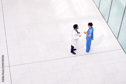 Overhead View Of Male Medical Staff Having Informal Meeting In Lobby Of Modern Hospital Building