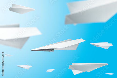 Overloaded airspace. Several paper planes. Blue sky on background.