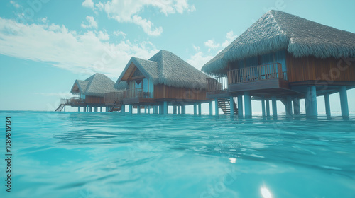 Overwater Bungalows with Thatched Roofs Set on Turquoise Waters.