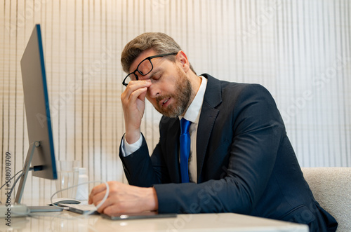 overworked tired businessman has migraine pain. photo of tired businessman has migraine