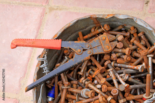 oxidation, rust, bolt, nut, mottled, noise, tool, feature, machinery, equipment, gear, old, rough, casting, brown, broken, ageing, dirt, corrosion, weathering, yellow, plier, box