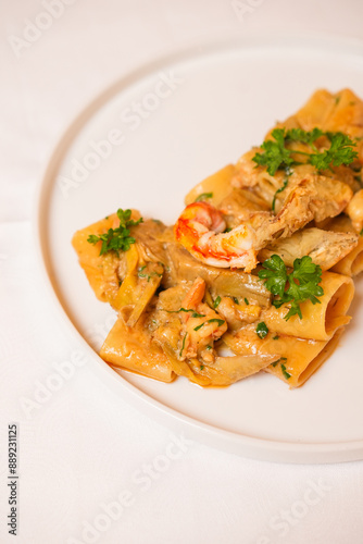 Paccheri con gamberi, carciofi e prezzemolo serviti in un ristorante come primo piatto
