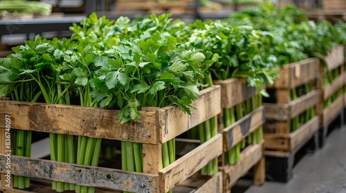 Packed wooden crates filled with fresh, green celery, neatly arranged and ready for shipment, set in a bustling warehouse