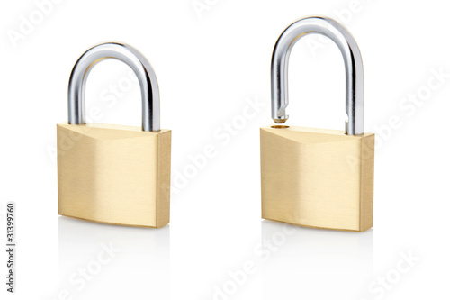 Padlock open closed isolated on white