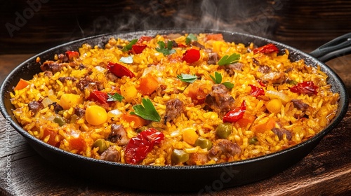 paella. Golden saffron paella steaming in a traditional pan, showcasing rich flavors and rustic charm. inspires cooking, menu design, designed for culinary blogs and recipe cards for restaurants.