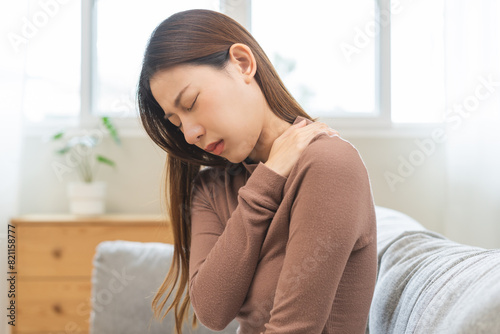 Pain body muscles stiff problem, suffer asian young woman, girl face painful, hand holding neck ache from work hand holding massaging rubbing shoulder hurt, sore sitting on couch at home. Health care