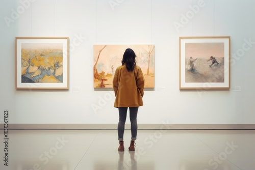 hi-res, art exhibition, painted image, picture frame, downloadable, art gallery, full-length, photo frame, art museum, collection, copy space, creativity, exhibition, one person, backview, clothing, daylight, footwear, standing, watching, apparel, drawing, gallery, looking, minimal, museum, person, yellow, adult, frame, human, image, paint, photo, woman, coat, shoe, wall, art, hd, painted, painting
