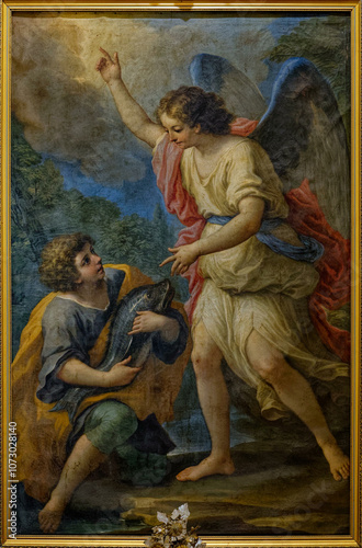 Painting of Archangel Raphael, chief guardian angel and patron saint of travelers. ...