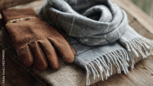 Pair of brown leather gloves and a grey scarf on a wooden surface. the gloves are resting on top of a beige-colored blanket, which is folded neatly.