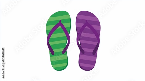 flip-flop, sandal, footwear, beach, summer, vacation, casual attire, style, comfort, striped, green, purple, design, illustration, isolated, white background, closeup, vibrant, colourful, accessory, fashion, relaxation, sunny, day, travel, leisure, holiday, walking, pool, spa, foot, protection, simple, modern, graphic, cartoon, thong, rubber, plastic, trendy, lifestyle, easy, flat, pair, single, object