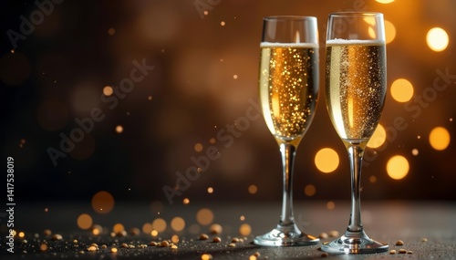 Pair of crystal champagne flutes filled with sparkling bubbly, party, wedding