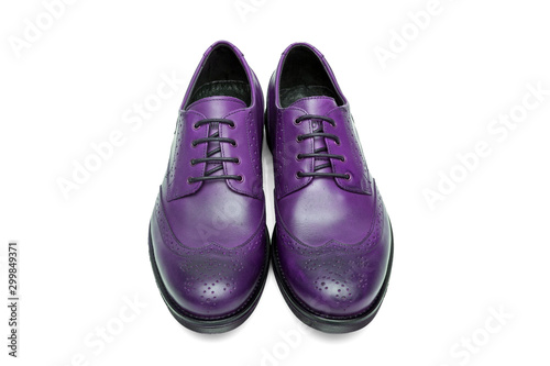 Pair of male purple leather shoes on white background, isolated product, top view.