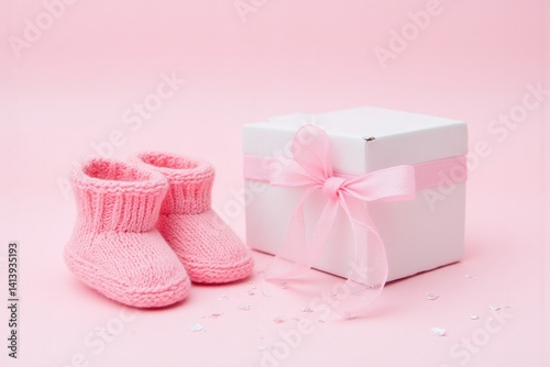 pair of pink baby booties next to a white gift box