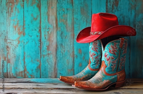 Pair of turquoise and brown cowboy boots with intricate stitching and a bright red cowboy hat resting on top, placed on rustic wooden surface with weathered turquoise wooden wall background