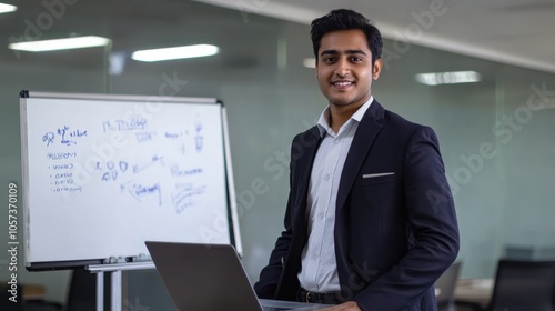 Pakistani businessman explaining financial data on a whiteboard, sleek laptop on desk, tidy office