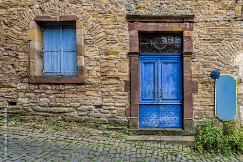Pale blue and worn door and windows on the stone walls of a sma