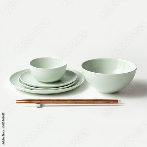 green, ceramic, dinnerware, set, bowl, plate, chopstick, pale, minimalist, simple, design, tableware, dish, eating, food, kitchen, home, elegant, subtile, matte, smooth, contemporary, modern, stylish, chic, aesthetic, clean, fresh, calm, serene, pastel, light, colours, porcelain, stoneware, serving, dining, meal, japan, asian, oriental, rustic, natural, wood, bamboo