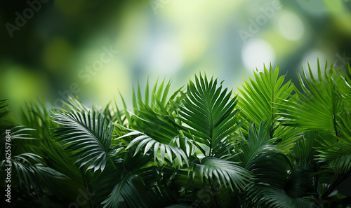 Palm leaves background with copy space. Adventure nature background of green forest, tropical forest in green filter, concept of ecology and destination progress, freedom journey lifestyle