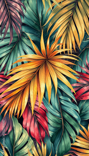 Palm leaves. Oil painting. Pattern for printing on wall decorations, covers, leaflets, business cards
