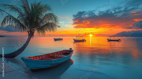 Palm Tree and Boats at Dawn: Early morning shot of a palm tree with small fishing boats on the horizon.