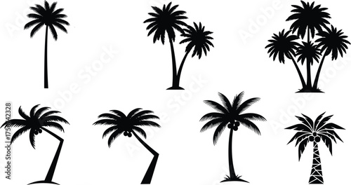 Palm tree silhouette vector illustration set, black tropical icons, artistic clipart bundle for design, abstract, seasonal, botanical, decorative, and exotic use