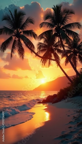 Palm trees on a warm sandy beach at sunset with soft focus and film grain texture , sunset, coastal scenery, ocean views