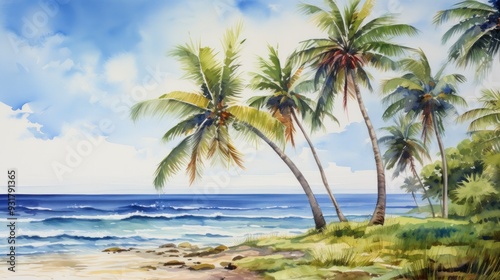 Palm trees on the beach with sea in the ocean. Watercolor painting