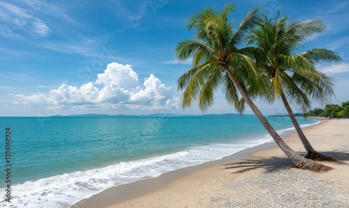 Palm trees swaying over quiet beach with crystal blue ocean and minimal white clouds in the horizon